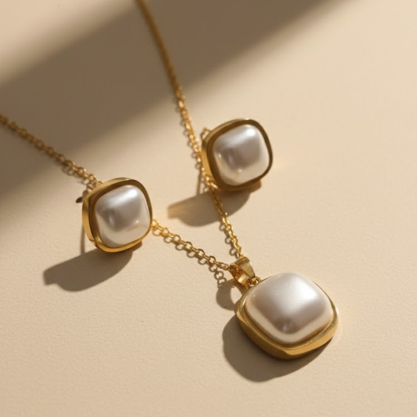 Add timeless elegance to your look with this Gold Plated Pearl Jewelry Set, featuring a square-shaped soft-glow pearl beautifully framed in a luxurious gold border.