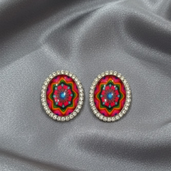 These Elegant Red Mandala Oval Stud Earrings are designed to add a bold and artistic touch to your everyday and festive looks. Featuring a striking red mandala pattern detailed with teal and gold tones, surrounded by a shimmering stone border — this pair is perfect for parties, casual wear, and gifting. A beautiful fusion of tradition and modern style.