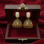 The dome-shaped jhumkas have a classic antique finish, paired with rectangular milky-white stone tops that add a soft, elegant touch.